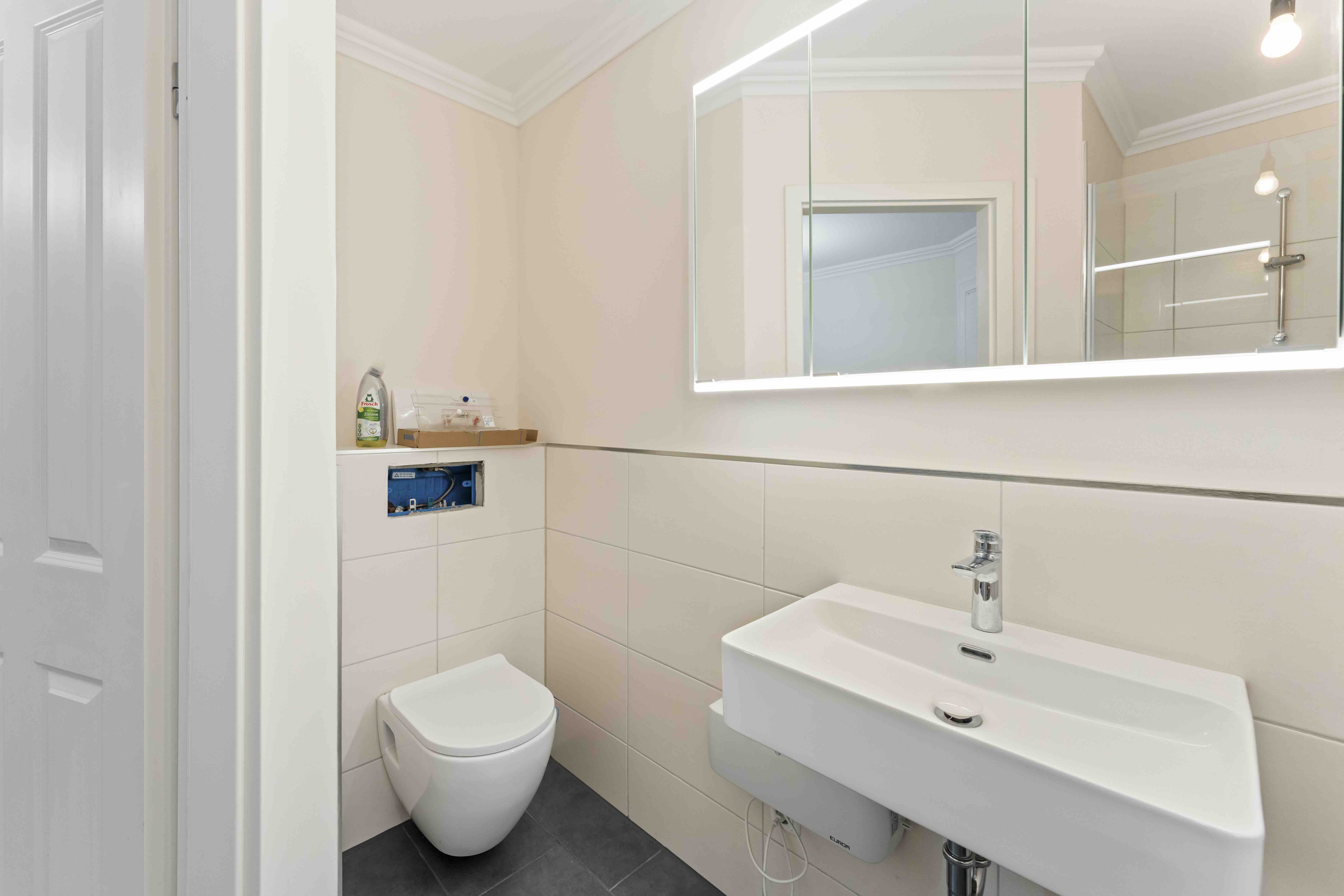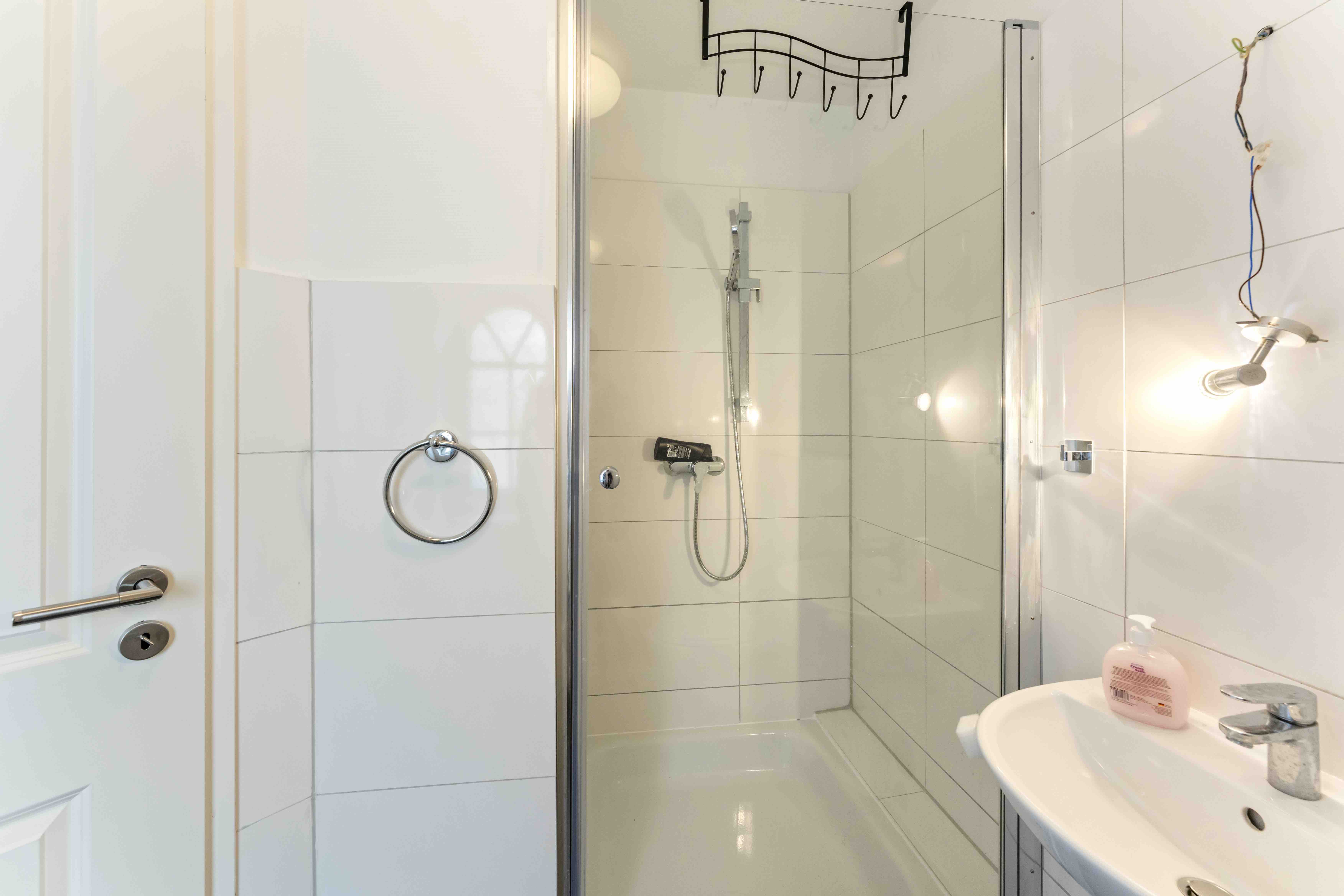 - Badezimmer: weiß gefliest, mit Badewanne, Dusche, Handtuchheizkörper und einer stilvollen Waschtischkommode